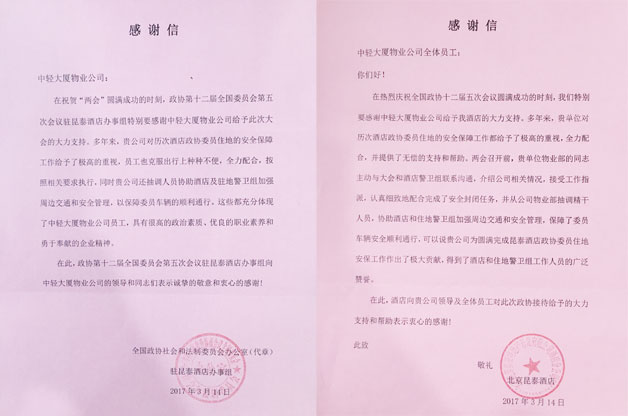 近日,公司分別收到全國政協(xié)社會和法制委員會辦公室及北京昆泰酒店致謝的兩封感謝信,兩家單位對于格瑞物業(yè)公司積極配合安保工作、圓滿完成保障任務表示衷心的感謝。