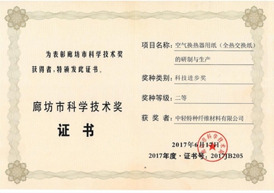 2017年6月17日,2017年度廊坊市科學(xué)技術(shù)獎(jiǎng)結(jié)果揭曉,中輕特種纖維材料有限公司的“空氣換熱器用紙(全熱交換紙)的研制與生產(chǎn)”獲得廊坊市科學(xué)技術(shù)獎(jiǎng)的科技進(jìn)步二等獎(jiǎng)。