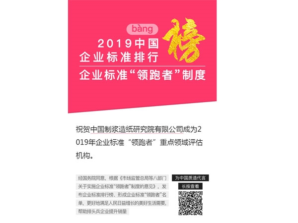 8月22日,中國(guó)標(biāo)準(zhǔn)化研究院發(fā)布了2019年企業(yè)標(biāo)準(zhǔn)“領(lǐng)跑者”評(píng)估方案及評(píng)估機(jī)構(gòu)名單,造紙?jiān)撼晒θ脒x企業(yè)標(biāo)準(zhǔn)“領(lǐng)跑者”評(píng)估機(jī)構(gòu)。