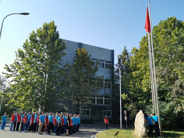 藍(lán)天麗日,金風(fēng)送爽。全體員工整齊肅立在旗桿前,齊聲高唱國歌,注視著五星紅旗冉冉升起,迎風(fēng)招展,表情莊嚴(yán)而自豪。