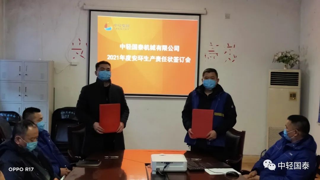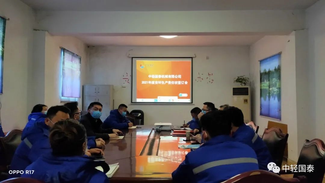 為進一步貫徹落實國務(wù)院安辦和上級公司關(guān)于歲末年初安全生產(chǎn)的一系列決策部署,全力確保春節(jié)期間安全生產(chǎn)和全年安全工作有序開展,2月5日下午13時,中輕國泰安委會在叉車中心舉行2021年度安全生產(chǎn)責任狀簽訂會,會議由安委會主任王林主持,各生產(chǎn)經(jīng)營單位班長及以上管理骨干參加會議并全部簽訂相關(guān)安全責任狀,安委會主任、總經(jīng)理王林作動員發(fā)言。