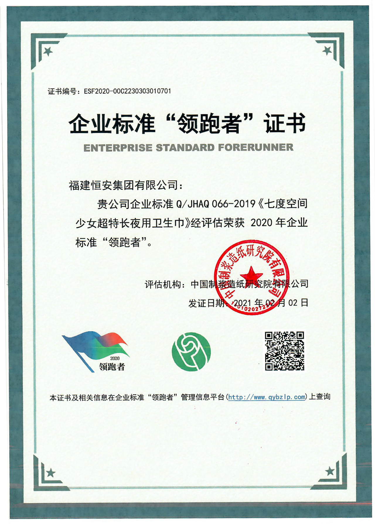 近日,中國造紙院作為評估機構(gòu),進行了2020年度“衛(wèi)生巾”產(chǎn)品領域企業(yè)標準“領跑者”評估工作。福建恒安集團有限公司企業(yè)標準Q/JHAQ006—2019《七度空間少女超特長夜用衛(wèi)生巾》通過評估,獲得了企業(yè)標準“領跑者”證書。