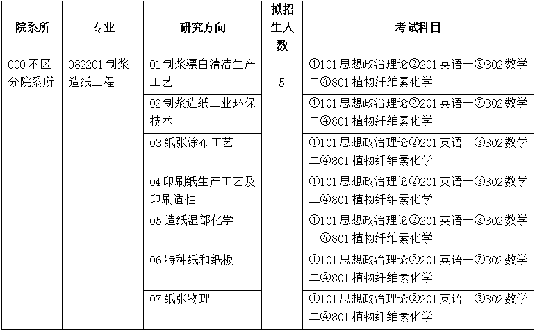 (三)全國統(tǒng)考初試科目為思想政治理論、英語(一)、數(shù)學(二)、植物纖維素化學,其中思想政治理論、英語(一)、數(shù)學(二)由教育部統(tǒng)一命題,植物纖維素化學由我院組織命題。