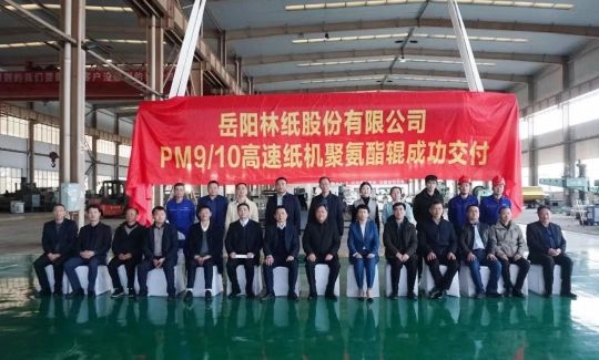活動現(xiàn)場舉行了中輕國泰的聚氨酯輥類包膠產(chǎn)品交付儀式,孫波董事長和葉蒙董事長共同為岳陽林紙PM9/10高速紙機聚氨酯輥揭幕。