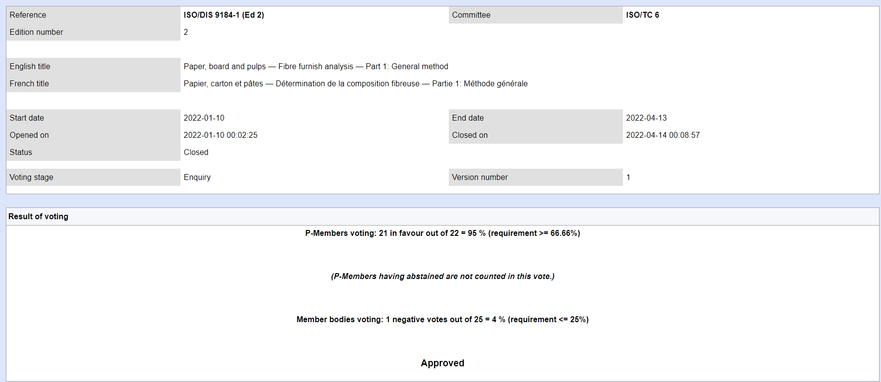 4月14日和4月18日,由中國造紙?jiān)褐鲗?dǎo)修訂的ISO9184-1《紙、紙板和紙漿—纖維組成分析第1部分:通用方法 》、ISO187《紙、紙板和紙漿—試樣處理和試驗(yàn)的標(biāo)準(zhǔn)大氣條件及其監(jiān)控程序》分別以95%和100%的高贊同率先后順利通過DIS投票。