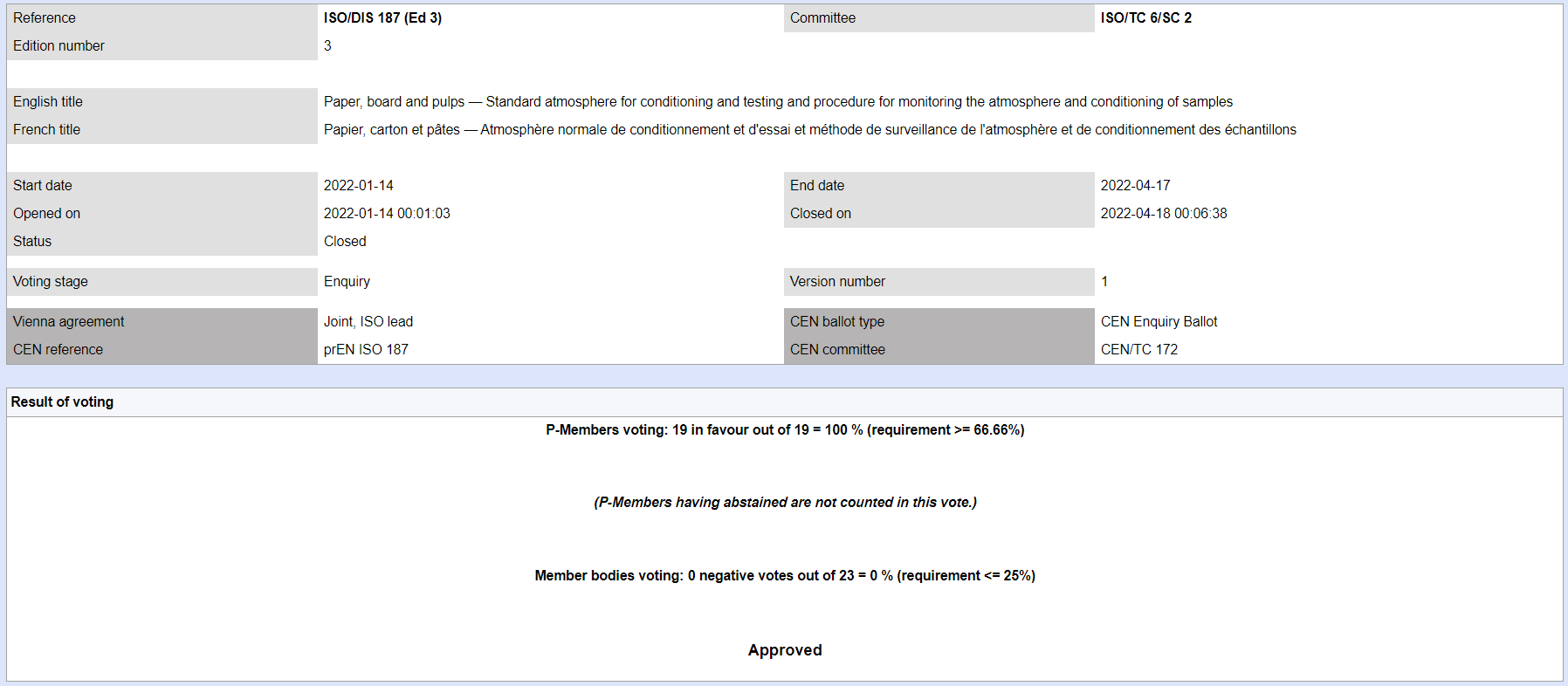 ISO187不僅是我國作為項(xiàng)目負(fù)責(zé)人主導(dǎo)修訂的國際標(biāo)準(zhǔn),同時(shí)也是由我國首次承擔(dān)造紙領(lǐng)域ISO工作組召集人所管理的標(biāo)準(zhǔn)項(xiàng)目。由于試樣處理及標(biāo)準(zhǔn)大氣條件是開展檢測試驗(yàn)的基礎(chǔ),在各個(gè)國家應(yīng)用廣泛,受到各國專家對(duì)標(biāo)準(zhǔn)的高度關(guān)注,召集人通過及時(shí)組織召開多次國際工作組網(wǎng)絡(luò)會(huì)議,研討標(biāo)準(zhǔn)的內(nèi)容、協(xié)調(diào)各國專家的反饋意見,確保該標(biāo)準(zhǔn)如期通過DIS投票。