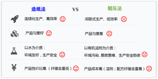 綠色纖維密封材料以非石棉礦物纖維為原料,對人體無毒無害。除了原料,制造技術(shù)方面也高下立判。相比傳統(tǒng)輥壓法,綠色纖維密封材料所使用的造紙法工藝,更為高效環(huán)保。話不多說,下面上圖比較。