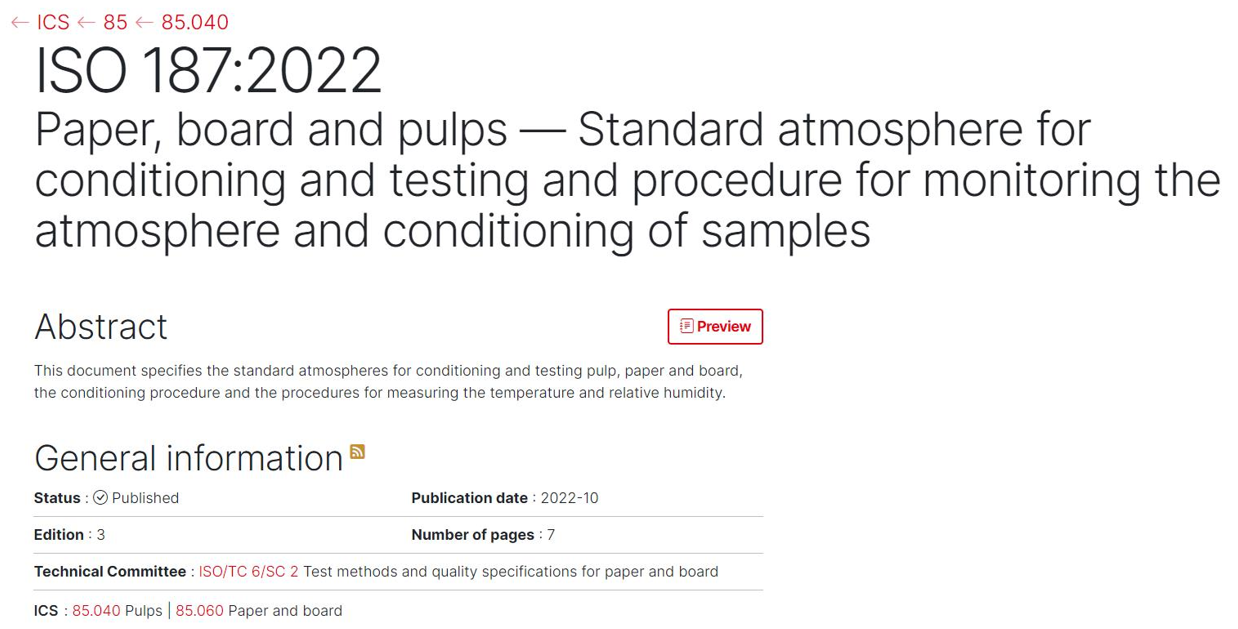 2022年10月18日,由中國造紙?jiān)籂款^制訂的ISO 187: 2022 Paper, board and pulps — Standard atmosphere for conditioning and testing and procedure for monitoring the atmosphere and conditioning of samples《紙、紙板和紙漿—試樣處理和試驗(yàn)的標(biāo)準(zhǔn)大氣條件及其監(jiān)控程序》國際標(biāo)準(zhǔn)正式發(fā)布,該標(biāo)準(zhǔn)是我國主導(dǎo)完成的第一項(xiàng)造紙領(lǐng)域國際標(biāo)準(zhǔn),也是我國專家首次擔(dān)任造紙領(lǐng)域ISO工作組召集人所管理的標(biāo)準(zhǔn)項(xiàng)目。