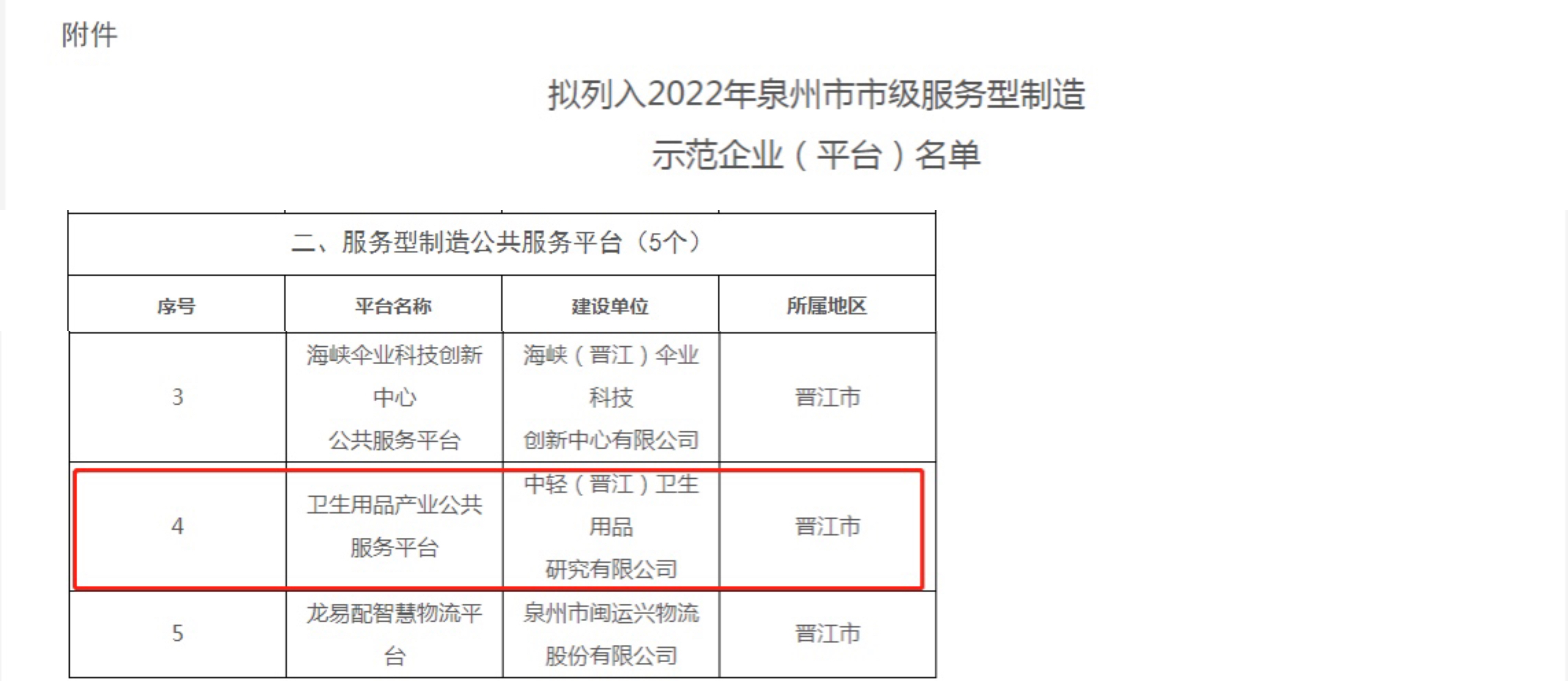 近日,泉州市工業(yè)和信息化局公布了2022年泉州市市級服務(wù)型制造示范名單,中國造紙院所屬中輕(晉江)衛(wèi)生用品研究有限公司(以下簡稱“中輕衛(wèi)品”)申報的衛(wèi)生用品產(chǎn)業(yè)公共服務(wù)平臺入選“泉州市市級服務(wù)型制造公共服務(wù)平臺”。此次成功入選充分肯定了中輕衛(wèi)品在衛(wèi)生用品領(lǐng)域的服務(wù)平臺作用,有助于進(jìn)一步推動衛(wèi)生用品產(chǎn)業(yè)科技創(chuàng)新、科技合作和科技信息共享,促進(jìn)衛(wèi)生用品產(chǎn)業(yè)轉(zhuǎn)型升級和健康持續(xù)發(fā)展。