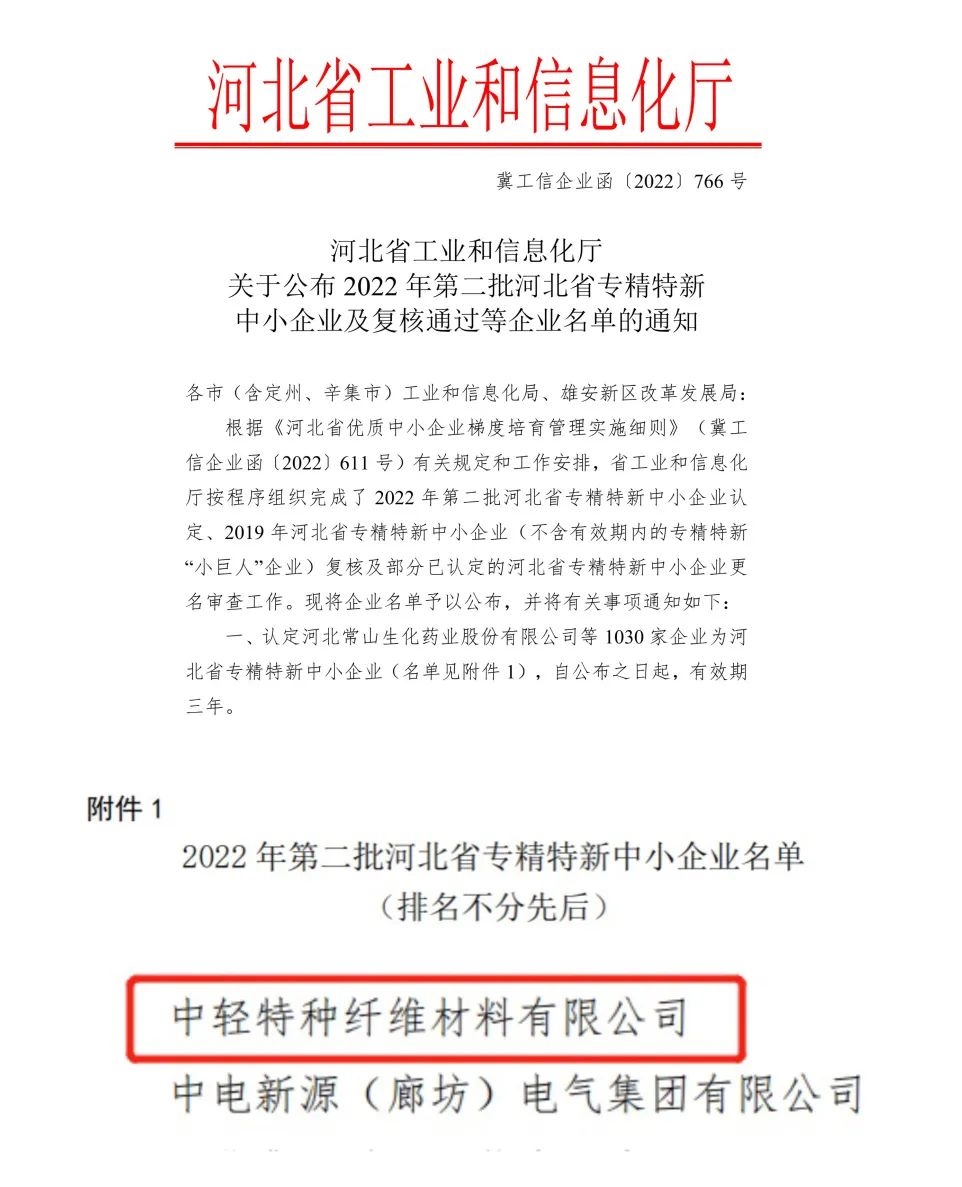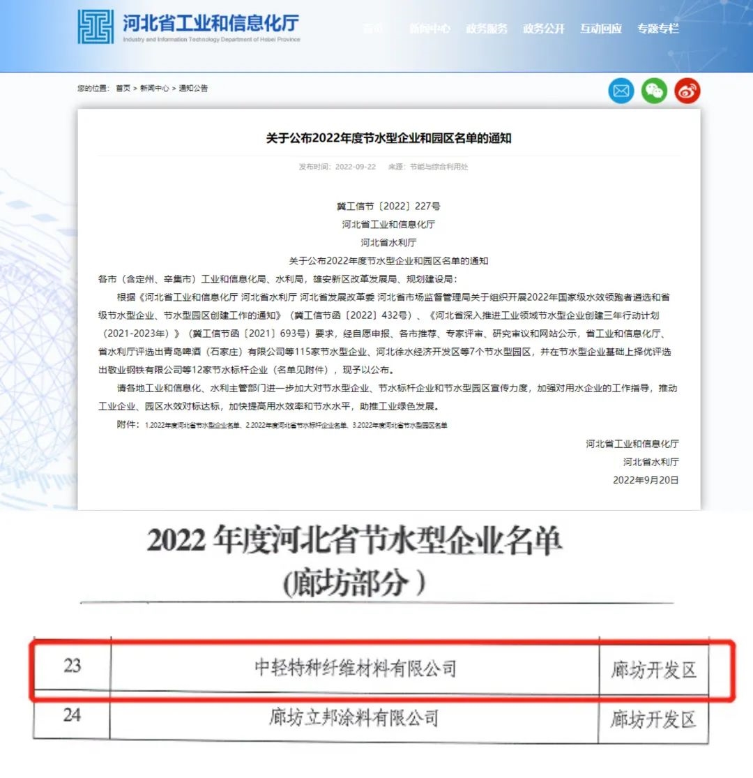 近日,河北省工業(yè)和信息化廳公布了2022年度第二批河北省專精特新中小企業(yè)名單和河北省節(jié)水型企業(yè)名單,中輕特材皆光榮上榜。