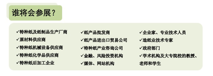 展會(huì)匯集國(guó)內(nèi)外特種紙行業(yè)上下游產(chǎn)業(yè)的專業(yè)買(mǎi)家,以及國(guó)內(nèi)外紙產(chǎn)品的批發(fā)商、經(jīng)銷(xiāo)商和進(jìn)出口貿(mào)易公司,供客商推廣、展示、宣傳特種紙相關(guān)產(chǎn)業(yè)科技成果與商務(wù)合作項(xiàng)目,引領(lǐng)特種紙產(chǎn)業(yè)發(fā)展方向,為尋求高附加值特種紙新品種的生產(chǎn)企業(yè)提供方向指導(dǎo),助力客戶展示自我,挖潛探新,推動(dòng)事業(yè)發(fā)展!
