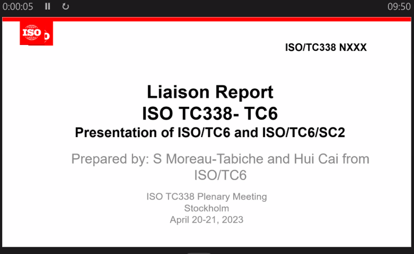 本次會議通過了全體會議議程,聽取了委員會經(jīng)理報告、ISO中央秘書處報告、工作組報告以及聯(lián)絡(luò)報告。專家代表對AHG 1、TG 1和WG 1工作組的在研項目進展與工作組會議情況進行了充分討論,最終形成了14項決議。標準化中心蔡慧博士作為ISO/TC 6和ISO/TC 6/SC 2的聯(lián)絡(luò)員,和法國專家S Moreau-Tabiche共同準備了聯(lián)絡(luò)報告,進行匯報。