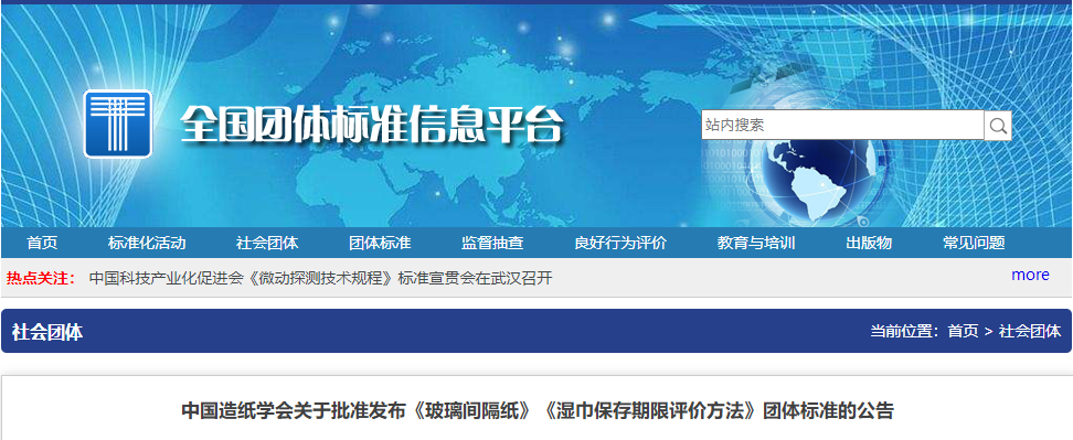 由中國制漿造紙研究院牽頭完成的《濕巾保存期限評價方法》(T/CTAPI 002—2023)《玻璃間隔紙》(T/CTAPI 001—2023)兩項團體標(biāo)準(zhǔn),經(jīng)中國造紙學(xué)會批準(zhǔn)于2023年10月25日正式發(fā)布,自2023年11月1日起實施。