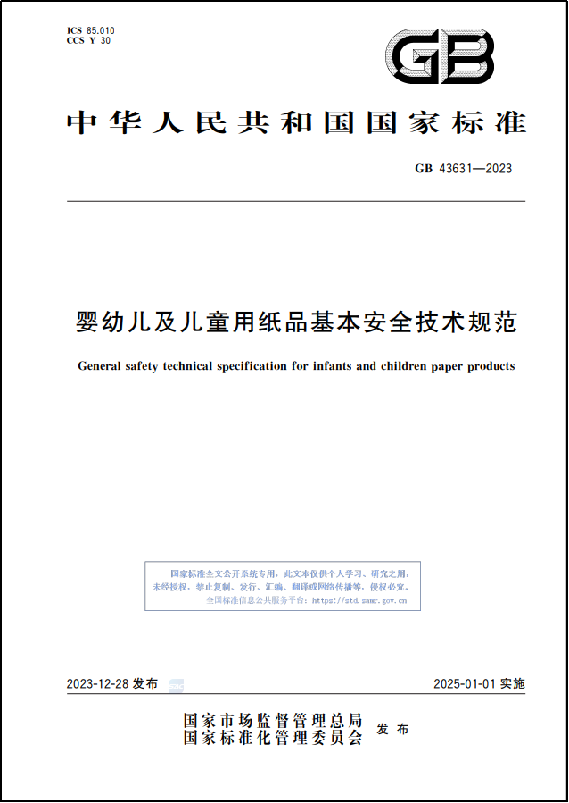 GB 43631—2023《嬰幼兒及兒童用紙品基本安全技術(shù)規(guī)范》強制性國家標(biāo)準(zhǔn)的研制,提升嬰幼兒及兒童用紙制消費品的質(zhì)量安全標(biāo)準(zhǔn)水平,既保障了嬰幼兒及兒童的健康安全,同時也符合國家相關(guān)政策精神。