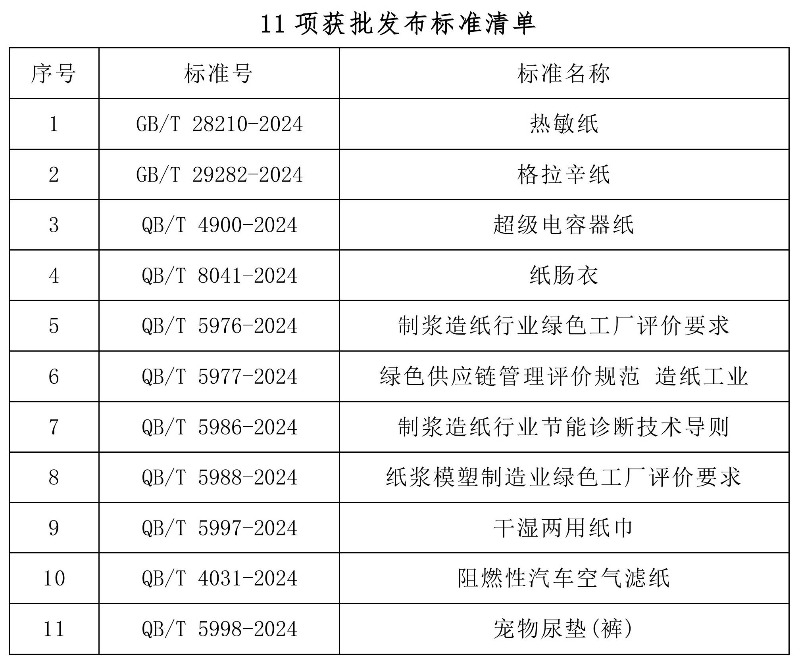 2024年,造紙標委會繼續(xù)堅持以行業(yè)需求為導向,不斷深化和完善造紙工業(yè)標準體系,引領造紙行業(yè)綠色、高質(zhì)量發(fā)展。截止目前,共有11項國家和行業(yè)標準獲批發(fā)布,19項國家和行業(yè)標準制修訂計劃批準下達。