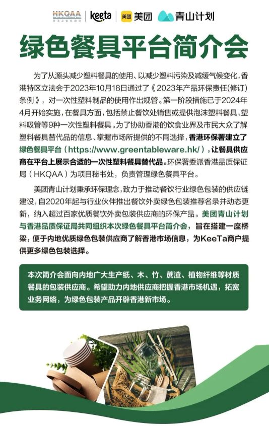 8月6日下午,中國制漿造紙研究院(以下簡稱“中國造紙院”)作為支持單位的綠色餐具平臺推介會成功在線舉辦。本場推介會由美團青山計劃與香港品質保證局共同組織,便于內(nèi)地優(yōu)質綠色包裝供應商了解香港市場信息,為在Keeta(美團在香港推出的外賣平臺)等外賣平臺上經(jīng)營的餐飲商戶提供更多綠色包裝選擇。