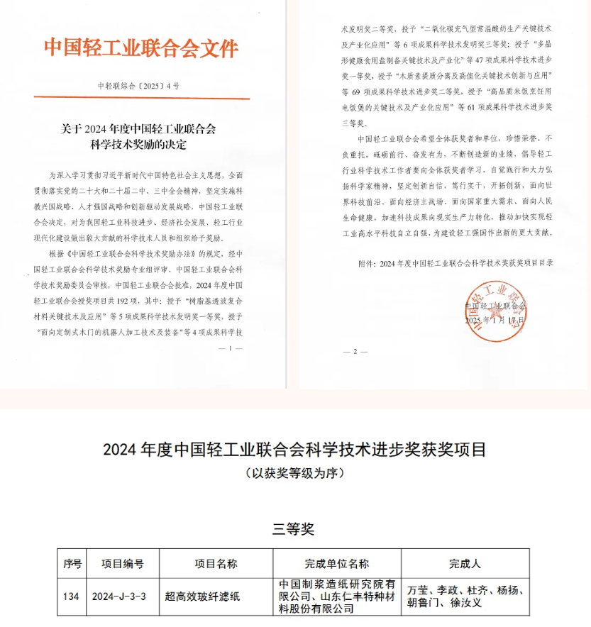 近日,“2024年中國輕工業(yè)聯(lián)合會科學技術獎”評選結果正式揭曉,由中國制漿造紙研究院申報的科技成果“超高效玻纖濾紙”榮獲科技進步獎三等獎。