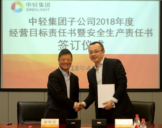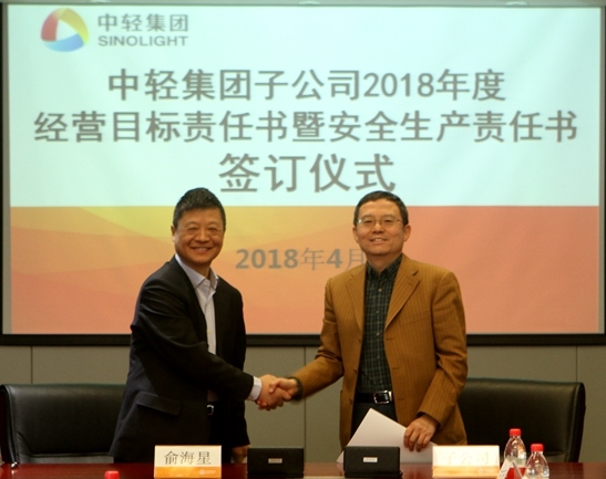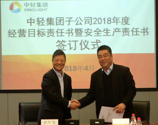 2018年4月9日,中輕集團子公司2018年度經營目標責任書暨安全生產責任書簽字儀式在中輕集團總部舉行。保利集團黨委常委、副總經理、中輕集團黨委書記、董事長陳鄂生在簽字儀式上作重要講話。中輕集團總經理俞海星代表中輕集團與10家子公司主要負責人簽訂了2018年度經營目標責任書和安全生產責任書。中輕集團副總經理任建平主持了簽字儀式,中輕集團領導班子成員、子公司主要負責人、中輕集團總部各部室負責人出席了簽字儀式。