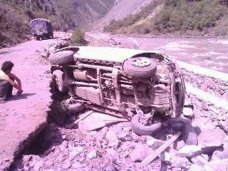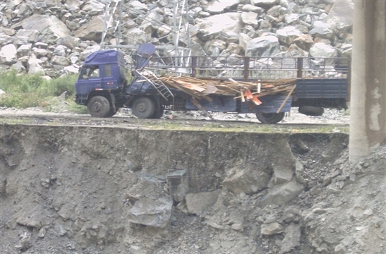 彭云:有天中午,我們從夾壁鄉(xiāng)衛(wèi)生院巡查完趕去另一個(gè)工地,兩個(gè)工地之間有一段未完工的317國道路基。受地震影響,道路遭受嚴(yán)重的破壞,兩邊山上時(shí)有滾石掉下。車在顛簸、搖晃中緩慢行駛,過了畢棚溝路口的小橋后是一個(gè)急轉(zhuǎn)彎。突然,前面從山上滾下一根木頭橫在車前,司機(jī)劉定峰大喊一聲“壞了!”,瞬間車子跳起來,劇烈搖晃,我下意識(shí)抱住了頭,身體在車內(nèi)左右撞擊,周圍的東西在搖晃,車在旋轉(zhuǎn),十幾秒鐘以后,一切戛然停止。我們又怔了十幾秒,“大家沒事吧?”我們異口同聲問道,我試著動(dòng)了動(dòng)四肢,沒受傷,其他人也都沒有受傷。在附近目睹這驚險(xiǎn)場(chǎng)面的工友們?nèi)颗苓^來拉我們出去。從車子里出來后,我們發(fā)現(xiàn)側(cè)翻車輛離河邊只有兩米!也要感謝劉定峰,在車摔到坑里前他死死的抓住方向盤,踩著剎車,避免了更大的險(xiǎn)情發(fā)生。