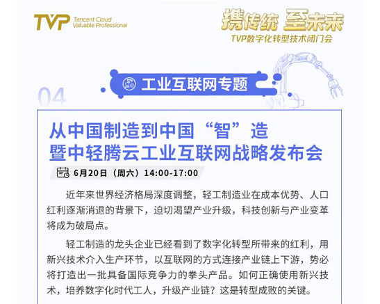 (中輕工業(yè)互聯(lián)網(wǎng)攜手騰訊云聯(lián)合打造TVP數(shù)字化轉(zhuǎn)型技術(shù)閉門會,暨中輕騰云工業(yè)互聯(lián)網(wǎng)戰(zhàn)略發(fā)布會)