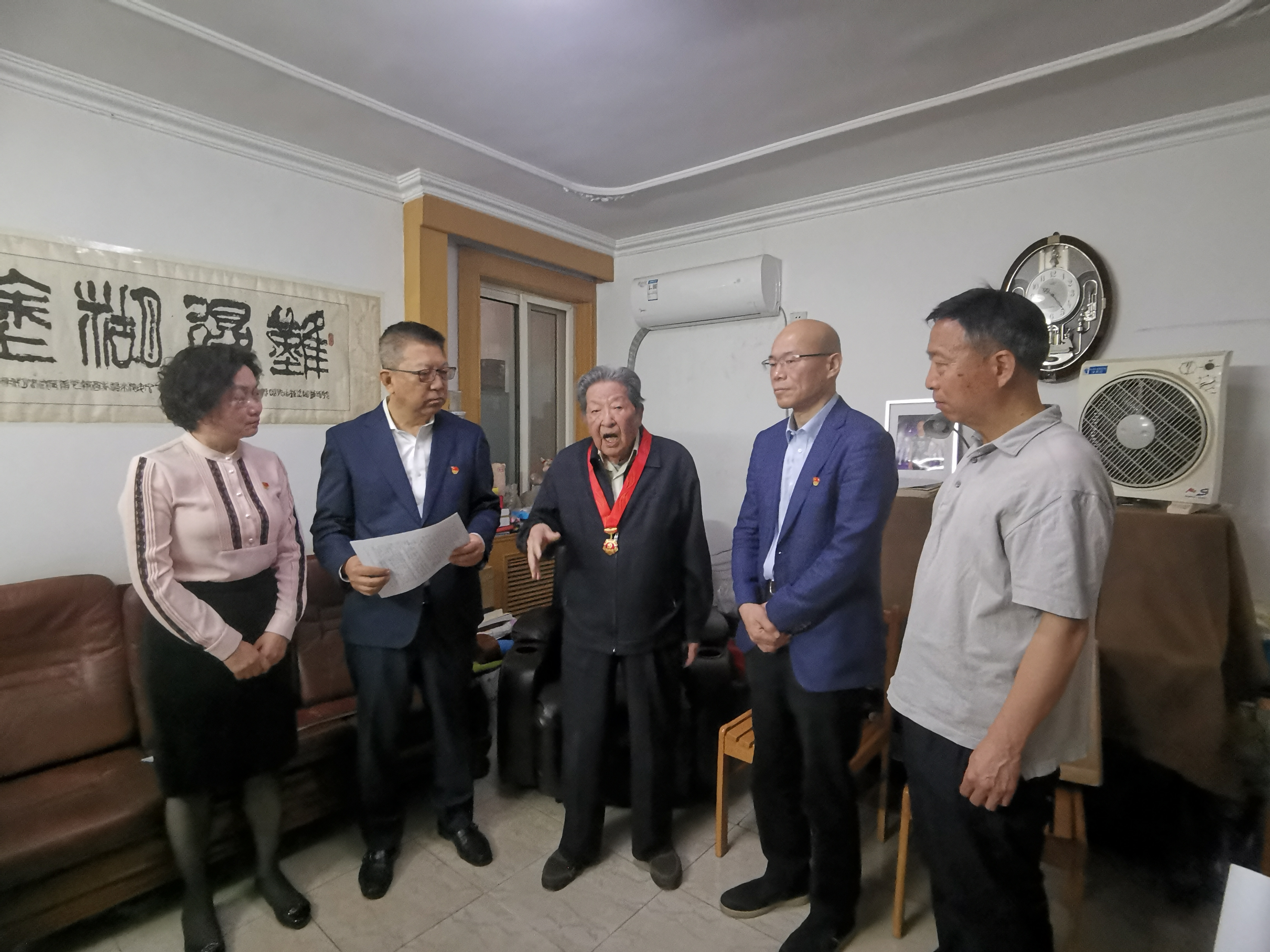 6月18日上午,劉軍才、張萬順、郭建全、曹文素一行前往73年黨齡的趙金生老先生家中慰問。1948年,趙老在東北民主聯(lián)軍六隊警衛(wèi)營行軍舟戰(zhàn)斗中立大功一次;1949年,在四野43軍司令部四連南下行軍中立功一次;建國后,遠赴朝鮮參加抗美援朝戰(zhàn)爭。劉軍才一行仔細觀摩趙老獲得的多枚紀念章,對他為黨的解放事業(yè)和新中國建設(shè)所做的貢獻表示感謝。