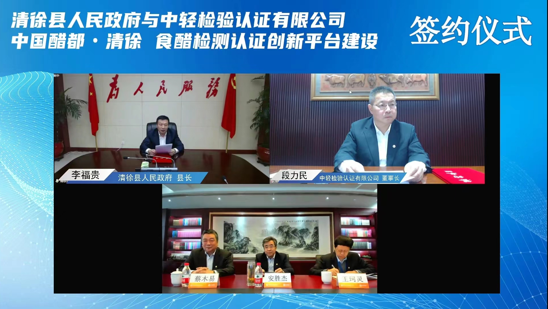 為進(jìn)一步落實(shí)習(xí)近平總書記在黨的二十大報(bào)告中提出的“必須堅(jiān)持科技是第一生產(chǎn)力、人才是第一資源、創(chuàng)新是第一動(dòng)力,深入實(shí)施科教興國戰(zhàn)略、人才強(qiáng)國戰(zhàn)略、創(chuàng)新驅(qū)動(dòng)發(fā)展戰(zhàn)略,開辟發(fā)展新領(lǐng)域新賽道,不斷塑造發(fā)展新動(dòng)能新優(yōu)勢。” 11月11日,保利中輕所屬中輕檢驗(yàn)與山西省太原市清徐縣人民政府以線上“云簽約”形式舉行食醋檢測認(rèn)證創(chuàng)新平臺(tái)合作項(xiàng)目簽約儀式。保利集團(tuán)總經(jīng)理助理,保利中輕黨委書記、董事長安勝杰;保利中輕黨委副書記、總經(jīng)理王珂靈,副總經(jīng)理蔡木易出席簽約儀式。