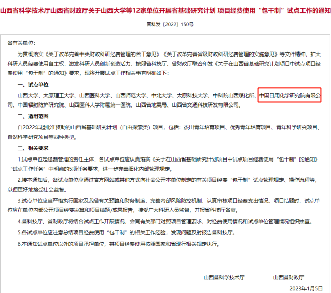 中國(guó)日用化學(xué)研究院獲批成為山西省基礎(chǔ)研究計(jì)劃項(xiàng)目經(jīng)費(fèi)使用“包干制”試點(diǎn)單位 。中國(guó)日用化學(xué)研究院將以此為契機(jī),加大科研投入,激發(fā)科研人員創(chuàng)造活力,不斷提升創(chuàng)新能力。