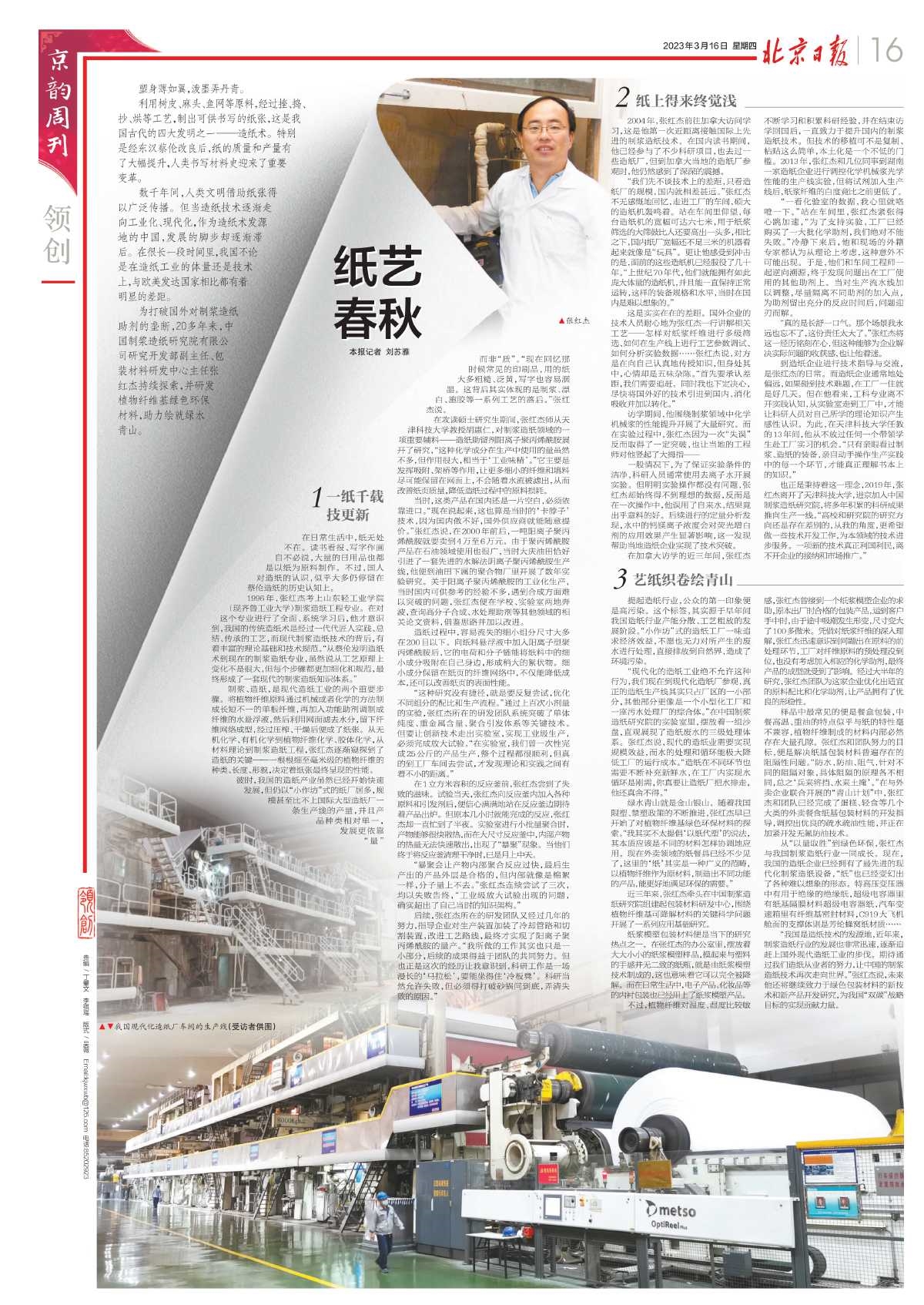 2023年3月16日,《北京日?qǐng)?bào)》“京韻周刊·領(lǐng)創(chuàng)”專欄以《紙藝春秋》為題,刊發(fā)保利中輕所屬中國制漿造紙研究院研究開發(fā)部副主任、包裝研發(fā)中心主任張紅杰及其團(tuán)隊(duì),為打破國外對(duì)制漿造紙助劑的壟斷,持續(xù)研發(fā)植物纖維基綠色環(huán)保材料,助力繪就綠水青山的故事。與大家分享——