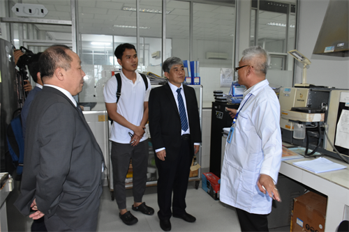 曹春昱一行首先來到柬埔寨國家科學技術(shù)創(chuàng)新實驗室(STINL),參觀水化學檢測室、重金屬元素分析室、果汁及啤酒中試車間等實驗室場所,詳細了解“一帶一路”聯(lián)合實驗室運行情況及此前中方援助設(shè)備使用情況。