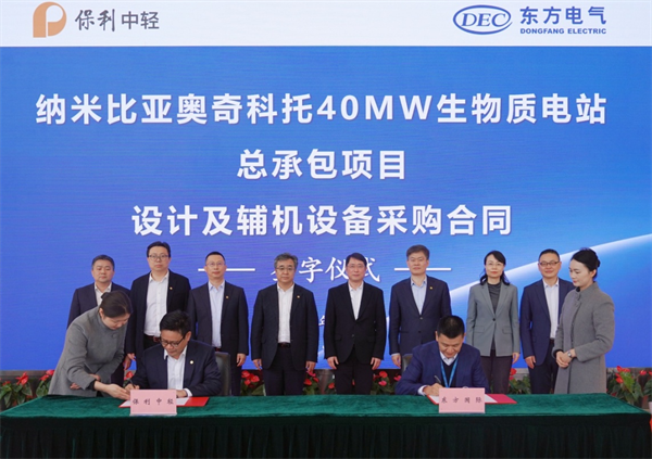 保利中輕副總經(jīng)理、中國海誠董事長趙國昂與東方國際副總經(jīng)理周杰代表雙方簽署戰(zhàn)略合作協(xié)議。中國海誠副總裁羅軍與東方國際機(jī)電事業(yè)部總經(jīng)理杜曉東代表雙方簽署納米比亞奧奇科托40MW生物質(zhì)電站總承包項目設(shè)計及輔機(jī)設(shè)備采購合同。簽約儀式前,雙方就深化合作深入友好交流。