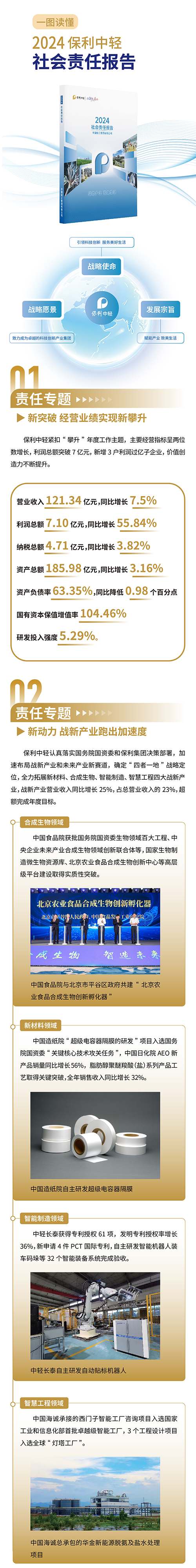 7月15日,保利中輕正式發(fā)布2024年度社會責任報告(簡稱“《報告》”)?!秷蟾妗啡娉尸F(xiàn)保利中輕聚焦服務國家戰(zhàn)略,深入實施國有企業(yè)改革深化提升行動、推進傳統(tǒng)產業(yè)轉型升級、積極布局戰(zhàn)略性新興產業(yè)、培育發(fā)展新質生產力、守護綠水青山等方面成果成效,以實際行動詮釋“美好生活領創(chuàng)者”責任擔當。