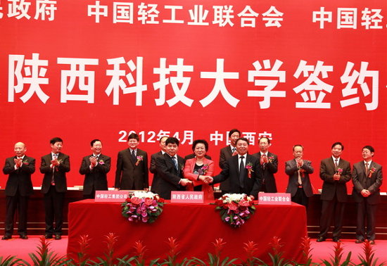 2012年4月17日,陜西省人民政府與中國(guó)輕工業(yè)聯(lián)合會(huì)、中國(guó)輕工集團(tuán)公司共建陜西科技大學(xué)簽約儀式在陜西科技大學(xué)隆重舉行。集團(tuán)公司董事長(zhǎng)、黨委書記陳鄂生出席簽約儀式,并代表集團(tuán)公司與陜西省朱靜芝副省長(zhǎng)、中國(guó)輕工業(yè)聯(lián)合會(huì)步正發(fā)會(huì)長(zhǎng)簽署共建協(xié)議。