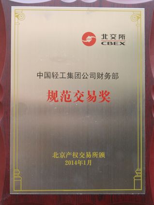 2014年1月北京產(chǎn)權(quán)交易所對25家國有產(chǎn)權(quán)交易規(guī)范操作的央企進行表彰,中輕集團財務部獲規(guī)范交易獎。
