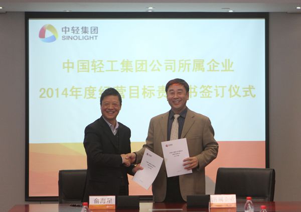 集團(tuán)公司總經(jīng)理俞海星在儀式上代表集團(tuán)公司與所屬11家二級(jí)企業(yè)主要負(fù)責(zé)人簽訂了2014年度經(jīng)營(yíng)目標(biāo)責(zé)任書。