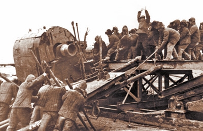大會戰(zhàn)時期,王進喜(中)和鉆井工人們?nèi)死缈高\鉆機,保障鉆井作業(yè)。(資料圖片)
