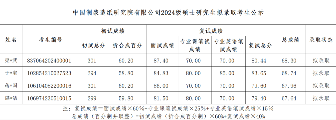 中國制漿造紙研究院有限公司2024級碩士研究生擬錄取考生公示