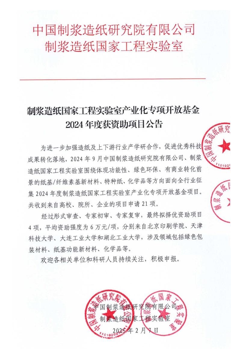 為進(jìn)一步加強(qiáng)造紙及上下游行業(yè)產(chǎn)學(xué)研合作,促進(jìn)優(yōu)秀科技成果轉(zhuǎn)化落地,中國(guó)制漿造紙研究院、制漿造紙國(guó)家工程實(shí)驗(yàn)室啟動(dòng)征集了2024年度制漿造紙國(guó)家工程實(shí)驗(yàn)室產(chǎn)業(yè)化專項(xiàng)開(kāi)放基金項(xiàng)目,得到了行業(yè)相關(guān)機(jī)構(gòu)的大力支持,現(xiàn)對(duì)征集和最終評(píng)審情況予以公告。歡迎各相關(guān)單位和科研人員持續(xù)關(guān)注該基金后續(xù)征集活動(dòng),積極申報(bào)。