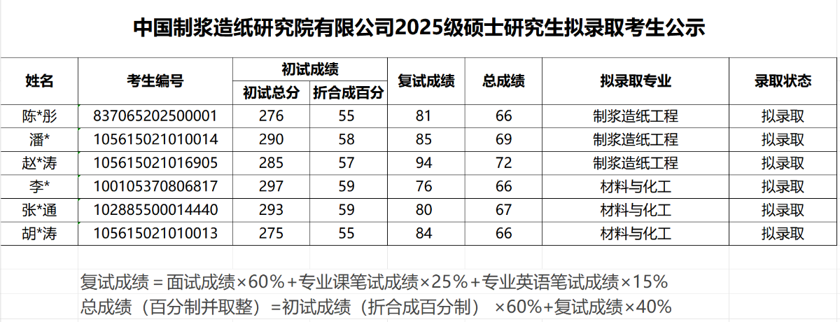 中國(guó)制漿造紙研究院有限公司2025級(jí)碩士研究生擬錄取考生公示
