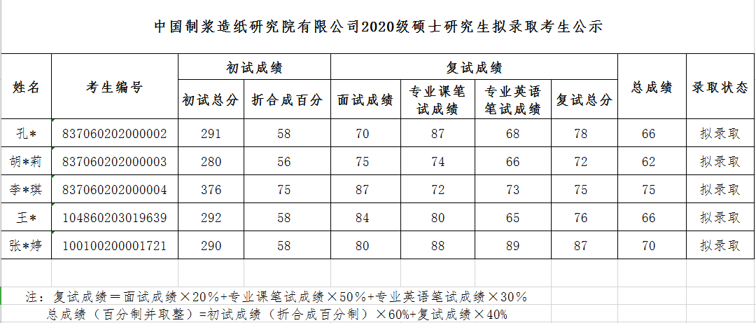 中國制漿造紙研究院有限公司2020級碩士研究生擬錄取考生公示