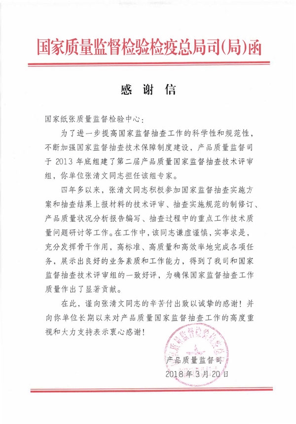 近日,國家質檢總局產品質量監(jiān)督司給造紙院質檢中心張清文同志發(fā)來感謝信,對張清文同志四年多以來為國家監(jiān)督抽查工作做出的顯著貢獻表示感謝。感謝信指出,產品質量監(jiān)督司于2013年底組建了第二屆產品質量監(jiān)督抽查技術評審組,張清文同志擔任該組專家。在此期間,張清文同志兢兢業(yè)業(yè),實事求是,高標準、高質量和高效率地完成了監(jiān)督司安排的各項任務,得到了監(jiān)督司和相關專家的一致好評。