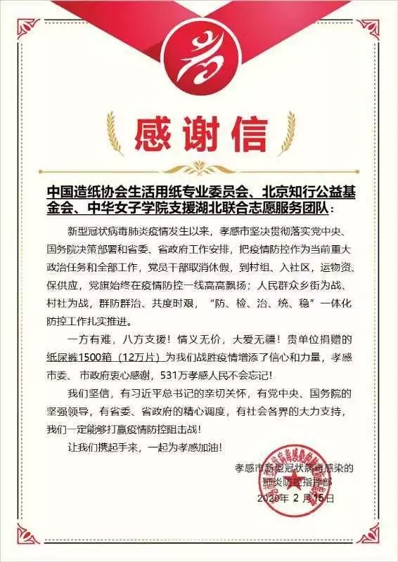 在新冠病毒肺炎疫情防控工作進入吃勁階段之際,2月11日,中輕集團造紙院積極發(fā)揮行業(yè)號召力,通過設(shè)立在造紙院的中國造紙協(xié)會生活用紙專業(yè)委員會秘書處發(fā)起“加油武漢”愛心募捐倡議活動,在兩天內(nèi)募集捐款169萬余元,并已完成成人紙尿褲等物資采購,送達至湖北地區(qū)相關(guān)醫(yī)院,馳援一線醫(yī)務人員。