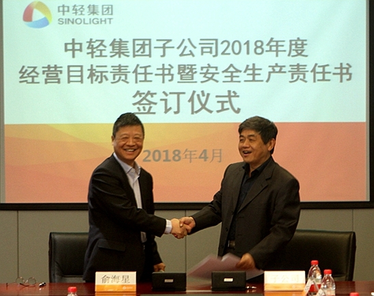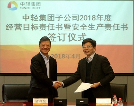 2018年4月9日,中輕集團子公司2018年度經營目標責任書暨安全生產責任書簽字儀式在中輕集團總部舉行。保利集團黨委常委、副總經理、中輕集團黨委書記、董事長陳鄂生在簽字儀式上作重要講話。中輕集團總經理俞海星代表中輕集團與10家子公司主要負責人簽訂了2018年度經營目標責任書和安全生產責任書。中輕集團副總經理任建平主持了簽字儀式,中輕集團領導班子成員、子公司主要負責人、中輕集團總部各部室負責人出席了簽字儀式。