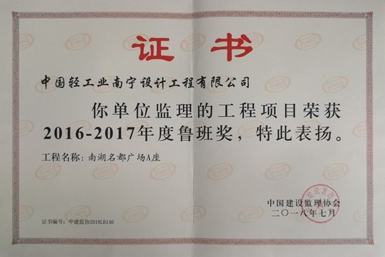 近日,海誠股份南寧公司監(jiān)理的工程項目—南湖名都廣場榮獲中國建設監(jiān)理協(xié)會授予“2016-2017年度魯班獎”。魯班獎是中國建筑行業(yè)工程質(zhì)量最高榮譽獎,這是公司繼廣西壯族自治區(qū)人民檢察院業(yè)務技術偵查綜合樓(2005年獲魯班獎)、廣西南寧市國土交易綜合樓(2011年獲魯班獎)后,再次獲此殊榮,具有里程碑的意義。