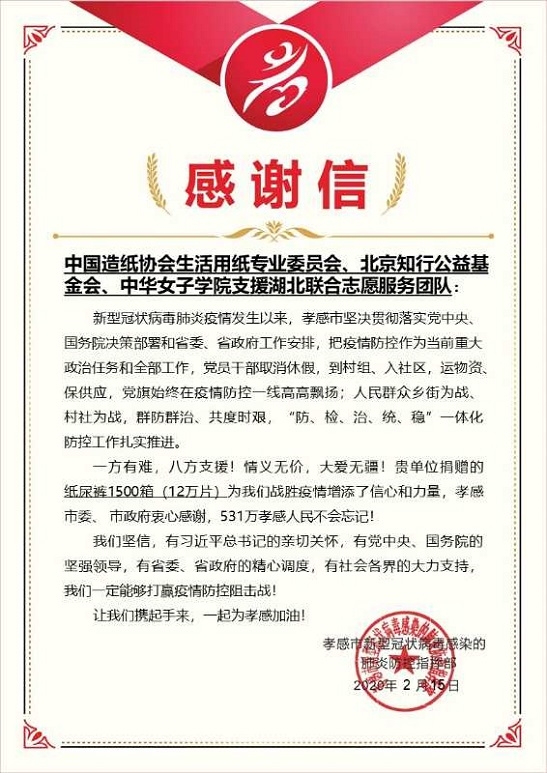 災(zāi)難無(wú)情,行業(yè)有愛(ài)!中國(guó)制漿造紙研究院有限公司、中國(guó)造紙協(xié)會(huì)生活用紙專(zhuān)業(yè)委員會(huì)以及衛(wèi)品行業(yè)的企業(yè)家和科技工作者用實(shí)際行動(dòng)踐行社會(huì)責(zé)任,齊心協(xié)力馳援湖北、共克時(shí)艱,為打贏這場(chǎng)疫情防控阻擊戰(zhàn)貢獻(xiàn)力量。