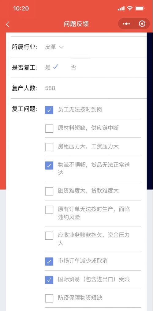企業(yè)可以一鍵反饋復(fù)工時(shí)遇到的問(wèn)題,問(wèn)題覆蓋員工到崗、融資問(wèn)題、供應(yīng)鏈問(wèn)題、物流問(wèn)題等10個(gè)方面。
