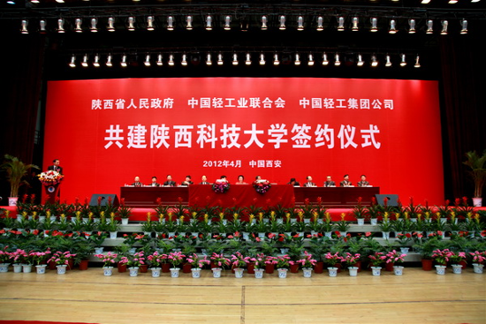 2012年4月17日,陜西省人民政府與中國(guó)輕工業(yè)聯(lián)合會(huì)、中國(guó)輕工集團(tuán)公司共建陜西科技大學(xué)簽約儀式在陜西科技大學(xué)隆重舉行。集團(tuán)公司董事長(zhǎng)、黨委書記陳鄂生出席簽約儀式,并代表集團(tuán)公司與陜西省朱靜芝副省長(zhǎng)、中國(guó)輕工業(yè)聯(lián)合會(huì)步正發(fā)會(huì)長(zhǎng)簽署共建協(xié)議。