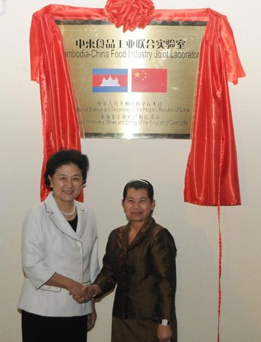 2012年12月7日,國(guó)務(wù)委員劉延?xùn)|與柬埔寨王國(guó)副首相梅森安在柬埔寨首都金邊共同為“中柬食品工業(yè)聯(lián)合實(shí)驗(yàn)室”揭牌。教育部部長(zhǎng)袁貴仁、科技部黨組書記王志剛、國(guó)務(wù)院副秘書長(zhǎng)江小涓、外交部副部長(zhǎng)宋濤及柬埔寨國(guó)務(wù)委員會(huì)、工業(yè)礦產(chǎn)及能源部、教育部、外交部等部門高級(jí)官員出席揭牌儀式。集團(tuán)公司陳鄂生董事長(zhǎng)出席儀式并陪同兩國(guó)領(lǐng)導(dǎo)人參觀了實(shí)驗(yàn)室。集團(tuán)公司所屬中國(guó)食品發(fā)酵工業(yè)研究院院長(zhǎng)蔡木易、中國(guó)海誠(chéng)股份南寧公司董事長(zhǎng)王毅軍等中柬雙方項(xiàng)目執(zhí)行人員參加了典禮。